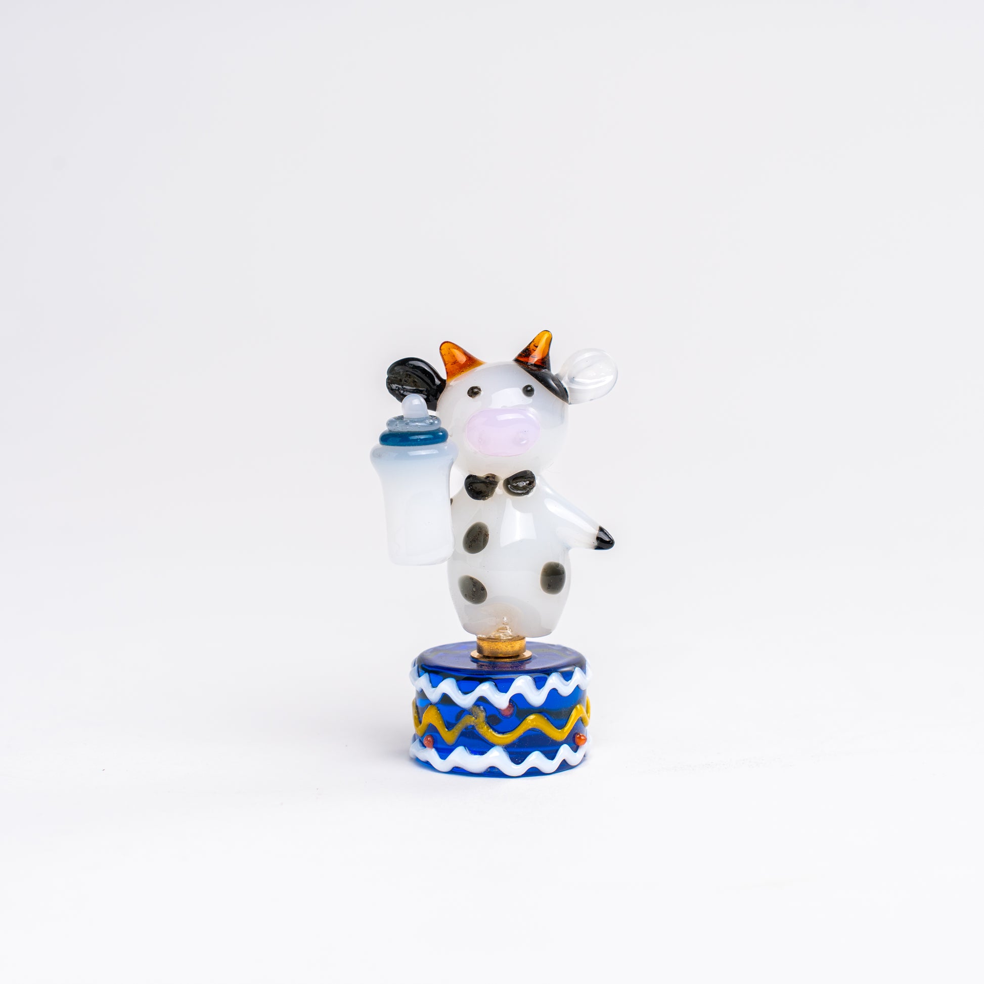 The gentle little cow holding a milk bottle — calm, curious, and always enjoying the show.